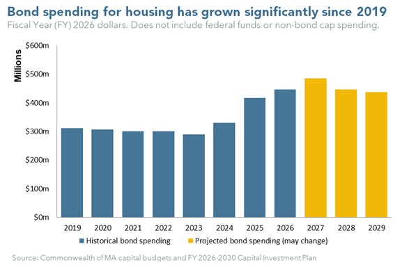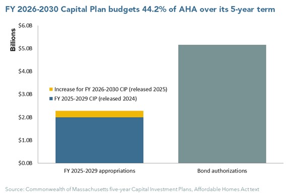 In August 2024, Governor Maura Healey signed the Affordable Homes Act (AHA), a five-year bond bill that aims to address the housing crisis by authorizing a wide range of capital investments. The AHA was signed in the midst of a deep housing shortage and affordability crisis: in February 2025, the state estimated that an additional 222,000 housing units must be built within the next decade in order to meet demand and stabilize housing costs.1 The AHA was rightly celebrated as an important milestone in the Commonwealth’s attempt to make housing more affordable.2 However, as MassBudget’s 2024 paper on the AHA notes, bond bills themselves are not investments and actual investment is planned in the capital budget each year. In June 2025, the Healey Administration released a capital budget for Fiscal Year (FY) 2026, as well as an updated five-year Capital Investment Plan for FYs 2026-2030. This paper provides an updated look at investments from the AHA, and discusses the limitations of bond spending without new revenue.