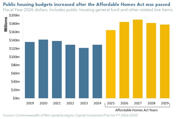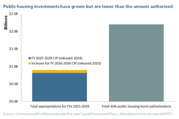 6 Commonwealth of Massachusetts, “FY 2026-2030 Capital Investment Plan by Capital Agency: Executive Office of Housing and Livable Communities,” June 30, 2025. The public housing total is the sum of line items H011, H012, H024, H026, and H029.