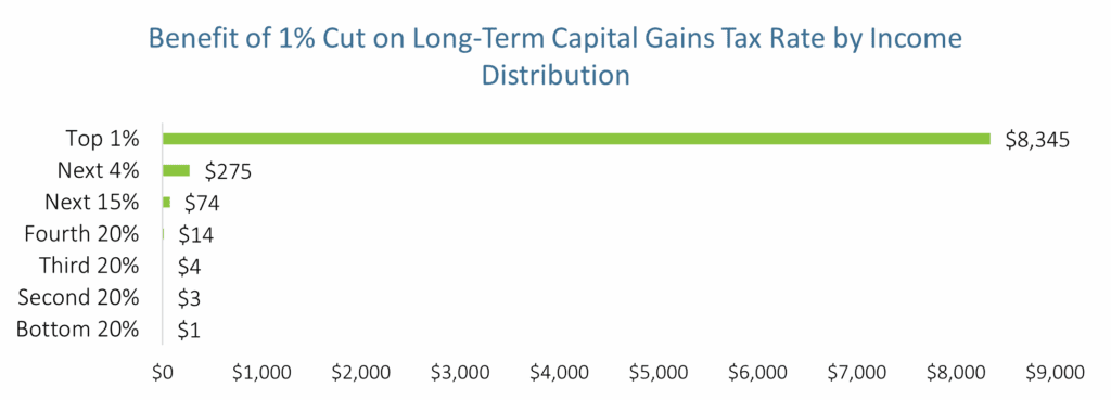 In dollar terms, the average household in the top 1 percent would receive a tax cut on these capital gains profits of about $8,300 annually. The bottom 80 percent of households, representing the broad middle class and low-income residents, would receive an average tax cut of only $6. The chart below disaggregates this data for other income groups.