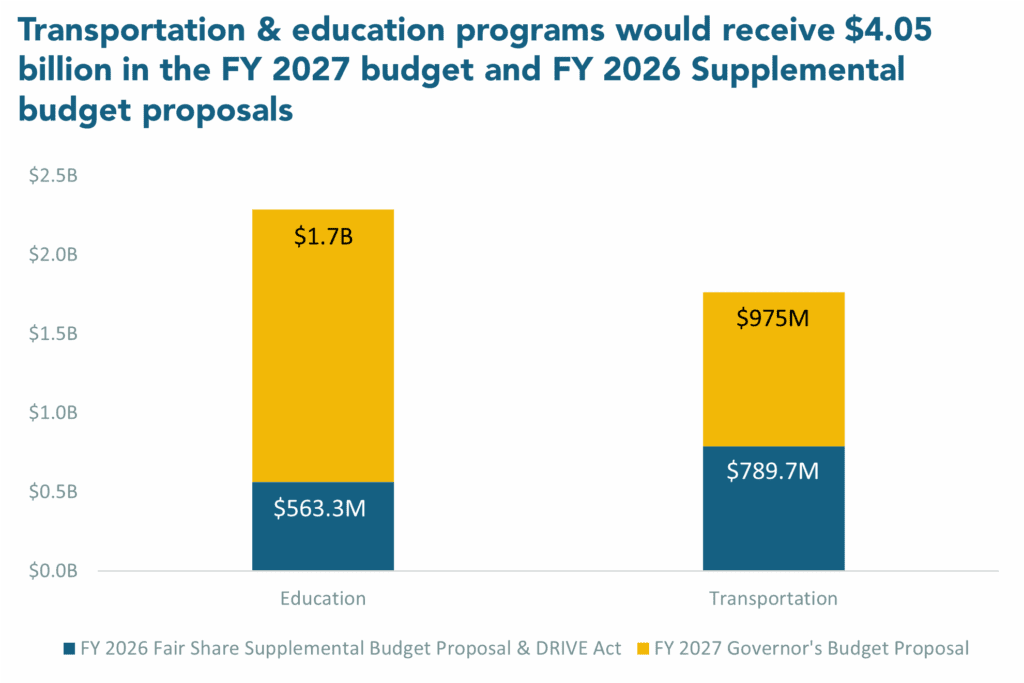 The governor’s FY 2027 budget proposal and accompanying FY 2026 supplemental budget proposal would continue the general improvement of transportation with greater investment since passage of the Fair Share surtax. These proposed budgets do not attempt to address longer-term strains in transportation funding. Fair Share, however, has enabled the upgrading of roads and bridges, making public transit safer, more accessible and reliable, and supporting local transportation priorities.